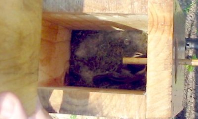 We hung up the house on a garden fence pole and, to my surprise, within a week, a pair of chickadee's moved in and built a nest. In fact, here is one of them now asking me to leave!